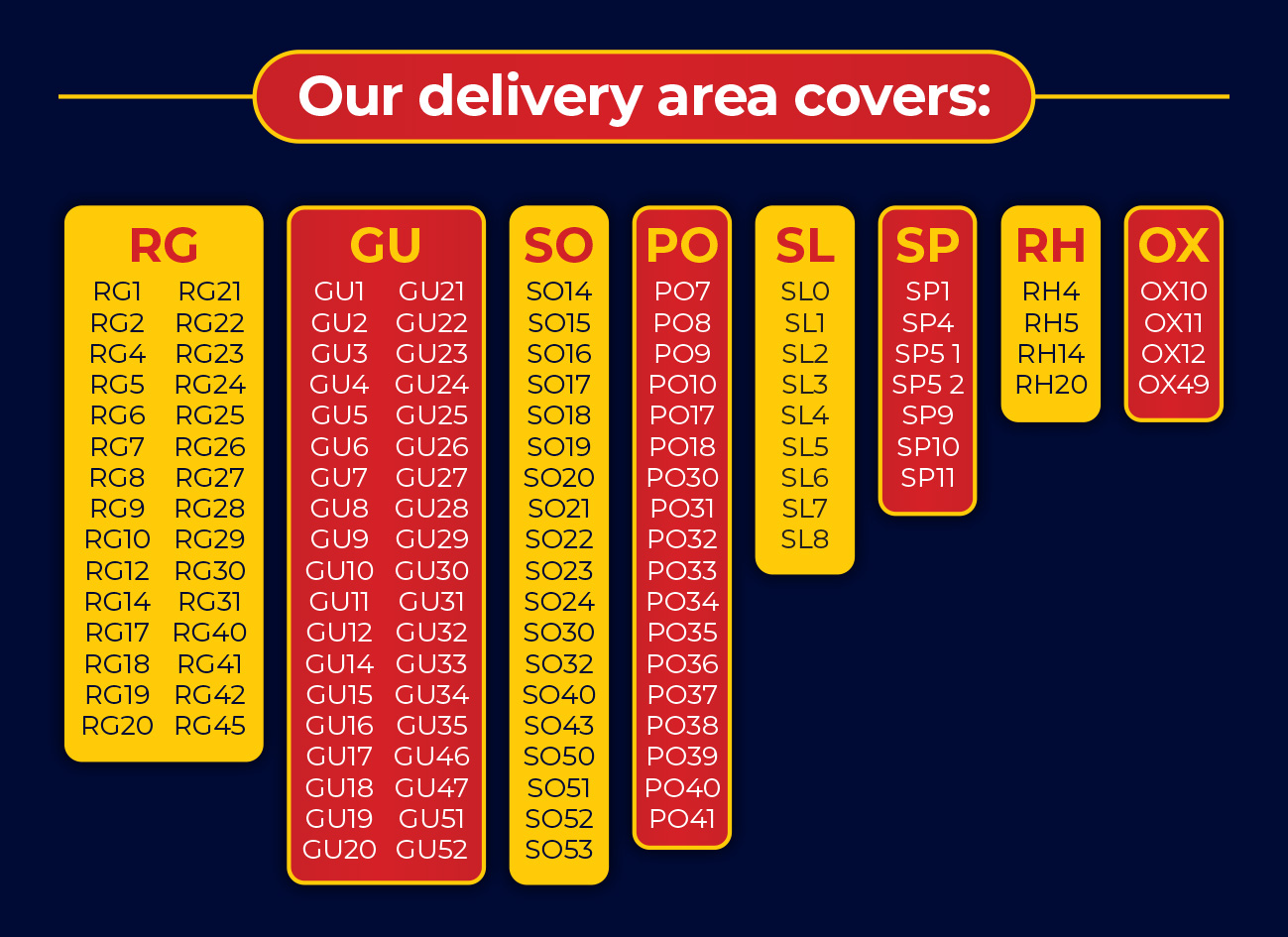 AldermastonAldershotAlresfordAltonAndoverAscotBagshotBasingstokeBerkshireBillingshurstBordonBracknellCamberleyChiddingfoldChobhamCranleighFarnboroughFarnhamFleetFrimleyGodalmingGoringGuildfordHampshireHartley WintneyHaslemereHenley on ThamesHindheadHookKingsclereLightwaterLiphookLissLudgershallMaidenheadMarlowMidhurstMortimerNettlebedNewburyOakleyOdihamOvertonPangbournePetersfieldPetworthReadingRomseySandhurstSloughStockbridgeSurreySutton ScotneyTadleyThatchamTwyfordWest MeonWest SussexWhitchurchWinchesterWindleshamWindsorWokingWokinghamYateley